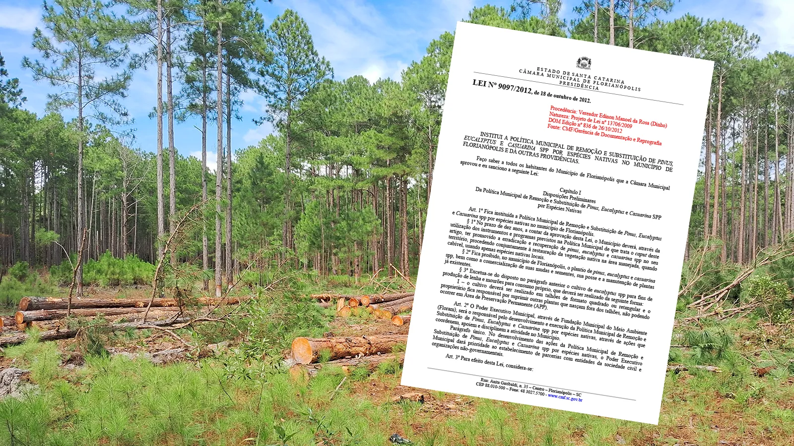O Município de Florianópolis possui um dos instrumentos jurídicos mais rigorosos do país para a proteção de sua biodiversidade: a Lei nº 9097/2012. Esta legislação institui a Política Municipal de Remoção e Substituição de Pinus, Eucalyptus e Casuarina spp por espécies nativas. O objetivo central é reverter o impacto das chamadas espécies exóticas invasoras, que ameaçam os habitats naturais e impedem a regeneração da Mata Atlântica e da restinga local.